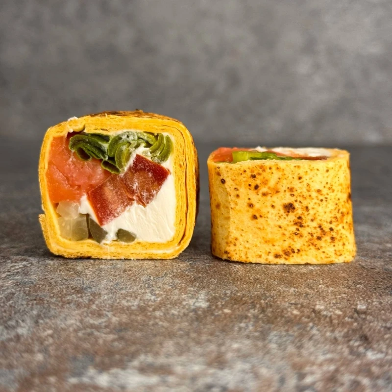ролл в тартили с копченым лососем и маринованным огучиком
