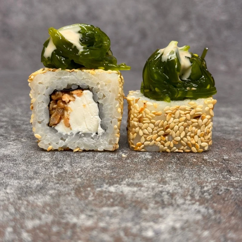 ролл с жареным лососем, украшается салатом чука и ореховым соусом