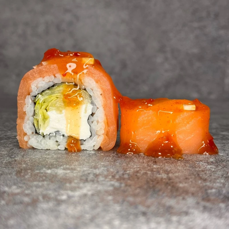 необычное сочетание.ролл с лососем, соусом сладкий чили и лимоном