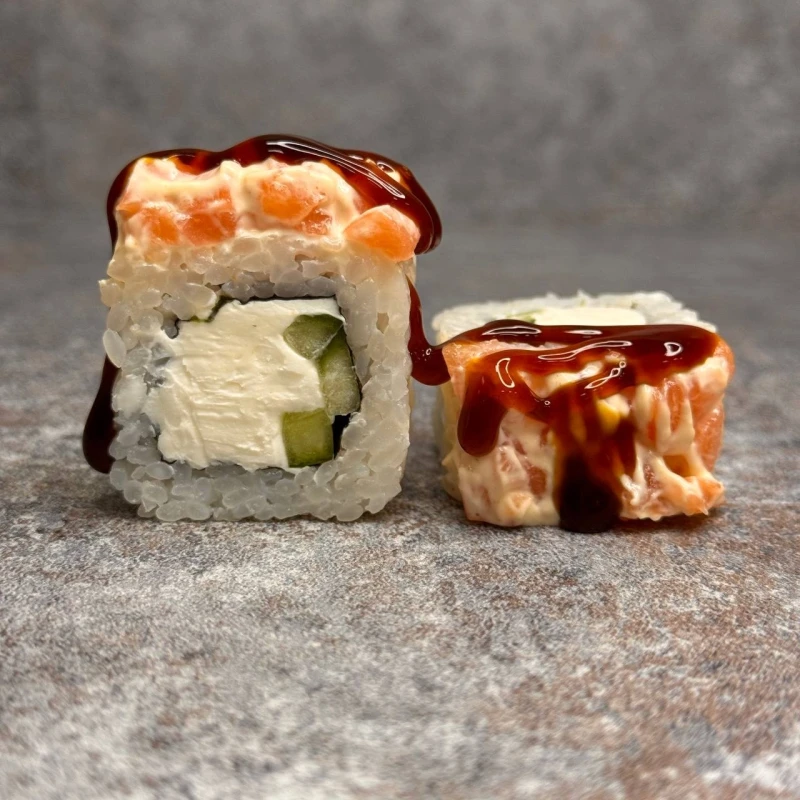 Ролл с творожным сыром ,огурцом и шапочкой из лосося с соусом спайси . украшается соусом унаги