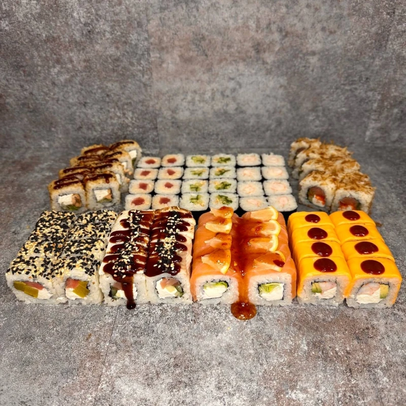 Состав: Филадельфия чили, Осако ролл, Кунцей бонито ролл,Канада ролл, Чикаго ролл, Эби чизз ролл, Эби маки, Тека маки, Каппа маки ( Имбирь, Васаби, Соевый соус входит в набор и общий вес блюда).