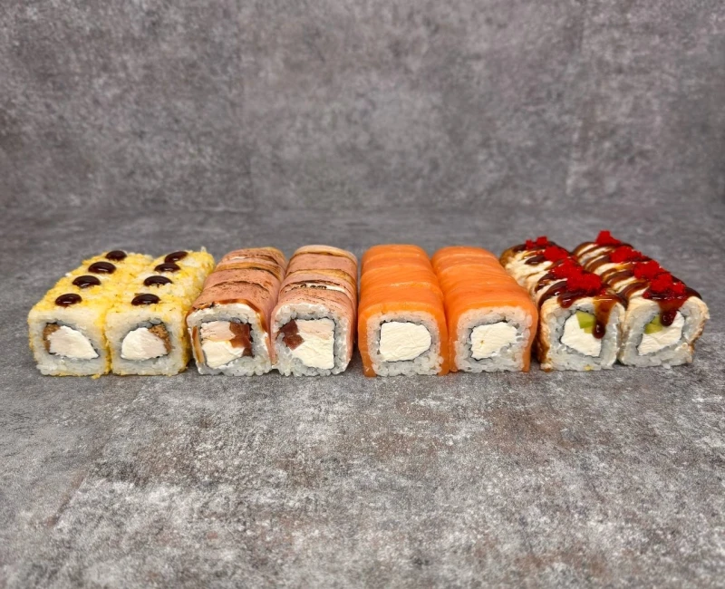 Состав: Филадельфия классическая,Унаги филадельфия ,Бекон чикен ролл, Кани терияки ( Имбирь, Васаби, Соевый соус входит в набор и общий вес блюда).